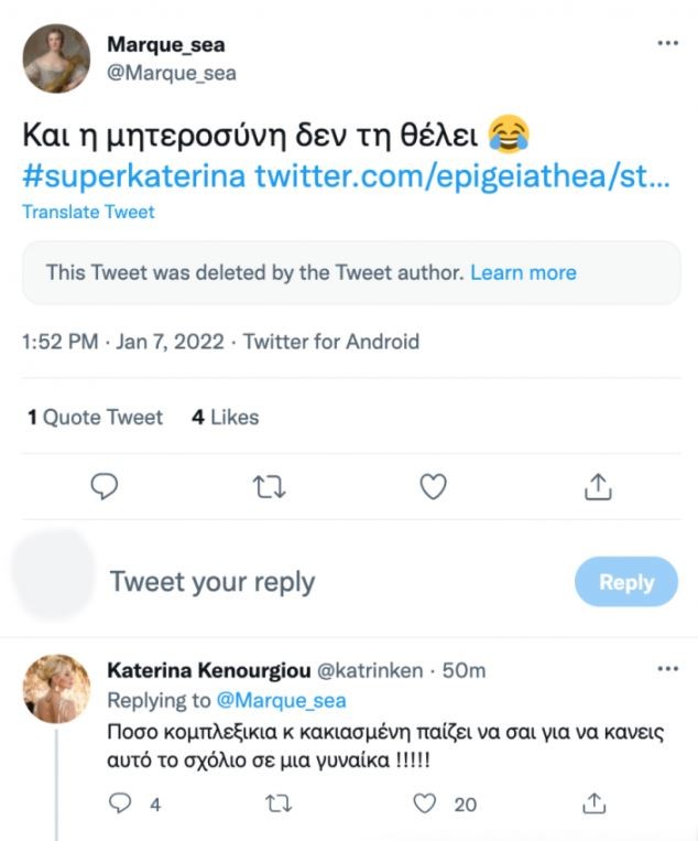 Το συγκεκριμένο προφίλ σχολίασε σε μια ανάρτηση που αφορούσε στην παρουσιάστρια και η οποία λίγο αργότερα σβήστηκε ότι «Ούτε η μητεροσύνη δεν τη θέλει». Έτσι, η Κατερίνα Καινούργιου της απάντησε αποκαλώντας την «κομπλεξικιά και κακιασμένη» που έκανε τέτοιο σχόλιο σε μια γυναίκα.