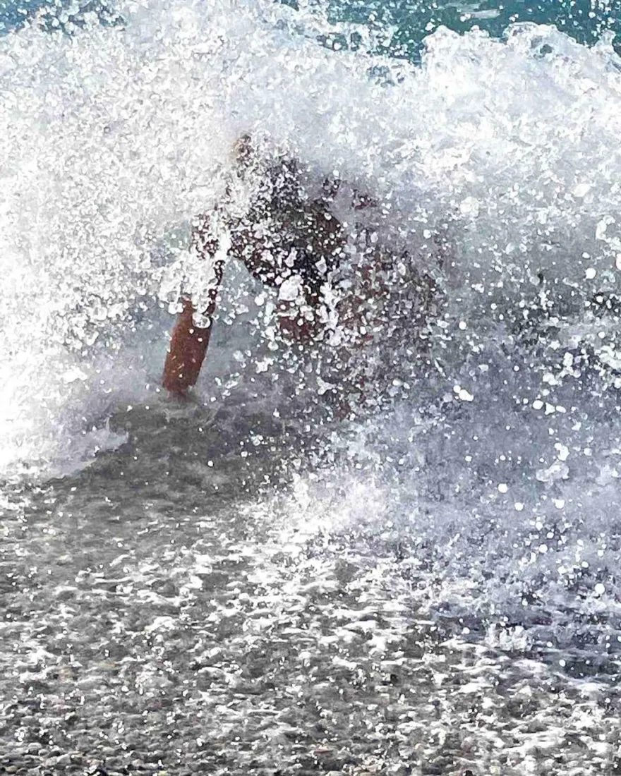 Φωτογραφίες από τη «μάχη» που έδωσε με τα κύματα δημοσίευσε η Κατερίνα Καραβάτου.