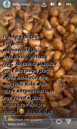 «Πολλά και συχνά γεύματα, πεντανόστιμα, βιταμίνες, φυτικές ίνες, λαχανικά μπήκαν στη διατροφή μας φουλ κι άλλαξαν το παιχνίδι. Κιλά που είχαν κατακάτσει από τη γέννα και μετά πήραν το δρόμο τους», έγραψε χαρακτηριστικά η 42χρονη Κλέλια.