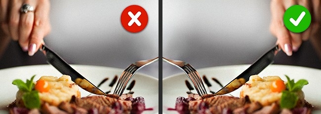 Με το δεξί χέρι κρατάμε το μαχαίρι με την λεπίδα προς τα κάτω, τον αντίχειρα τοποθετημένο στη κορυφή της λαβής και το δείκτη πάνω από τη λεπίδα. Με το αριστερό χέρι κρατάμε το πιρούνι με τα δόντια προς τα κάτω, τον αντίχειρα τοποθετημένο στη δεξιά πλευρά του πιρουνιού και το δείκτη πάνω από τη λαβή στο σημείο που τελειώνει η λαβή του πιρουνιού.Σταθεροποιούμε το φαγητό στο πιάτο με το πιρούνι και κόβουμε με το μαχαίρι ένα μικρό μέγεθος κάθε φορά. Αφού κόψουμε το φαγητό, το μαχαίρι παραμένει στο δεξί χέρι και το πιρούνι στο αριστερό και με το μαχαίρι σπρώχνουμε το φαγητό προς το πιρούνι. Τα δόντια του πιρουνιού παραμένουν προς τα κάτω ακόμα και όταν φέρουμε το φαγητό στο στόμα.