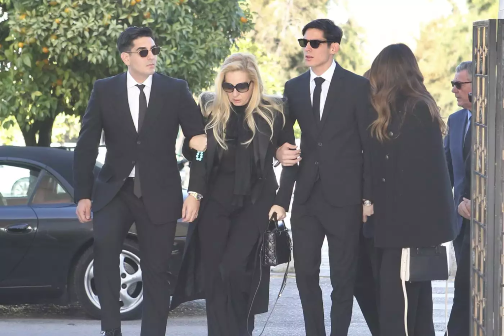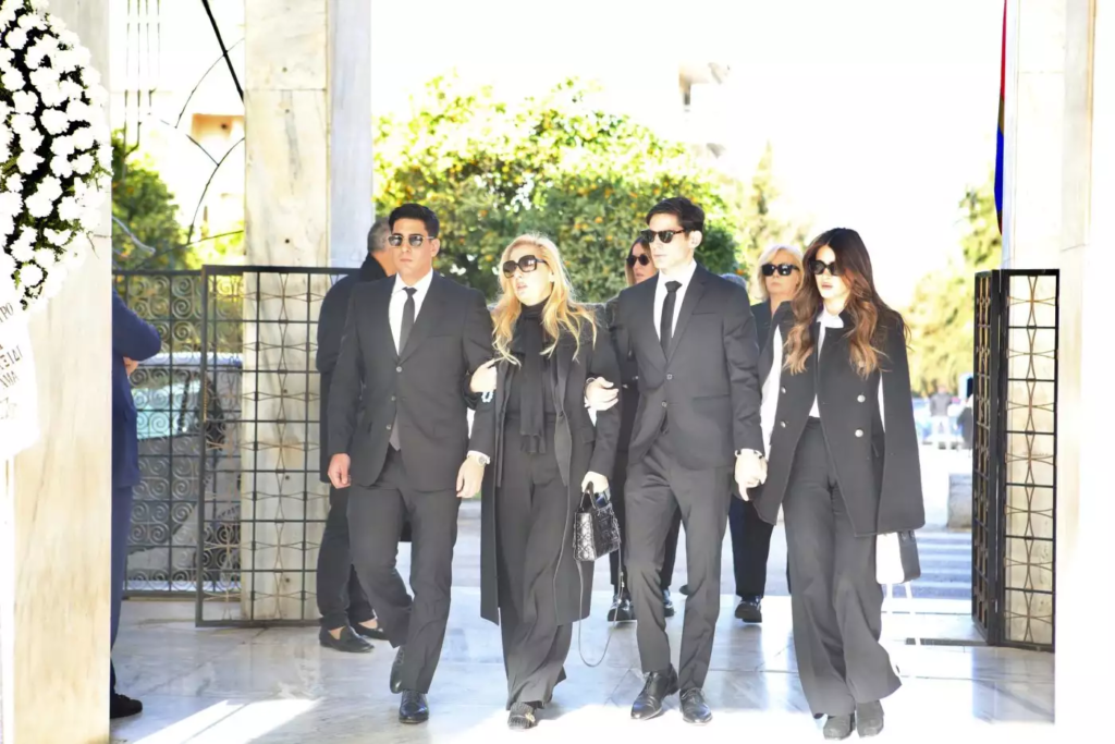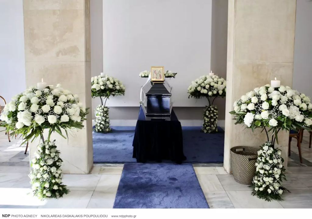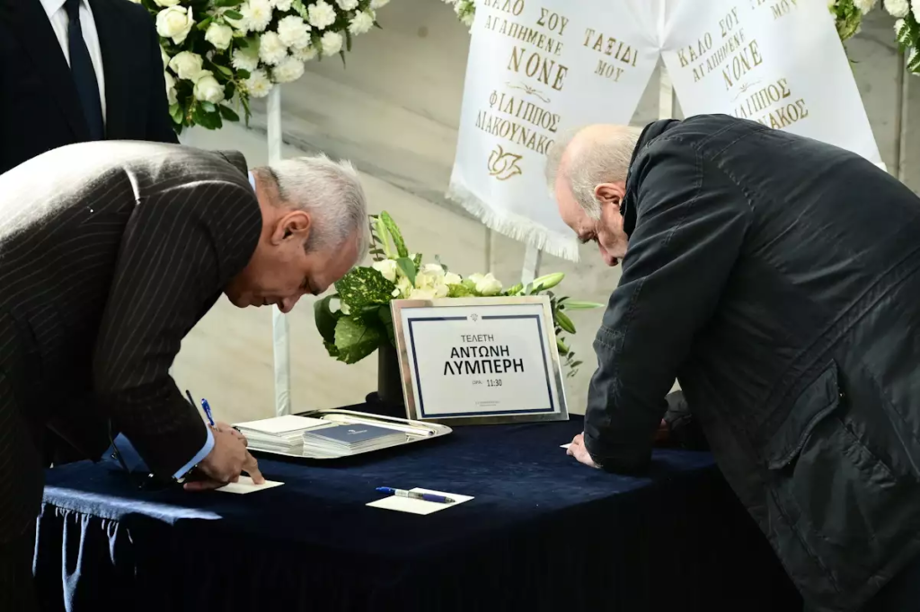 «Στον μαχητή μου» γράφει το στεφάνι της συζύγου του Αντώνη Λυμπέρη, Έλενας Μακρή που βρίσκεται πάνω στο φέρετρο του εκδότη, ενώ η ίδια έφτασε υποβασταζόμενη από τα τρία της παιδιά στο Α’ Κοιμητήριο Αθηνών.