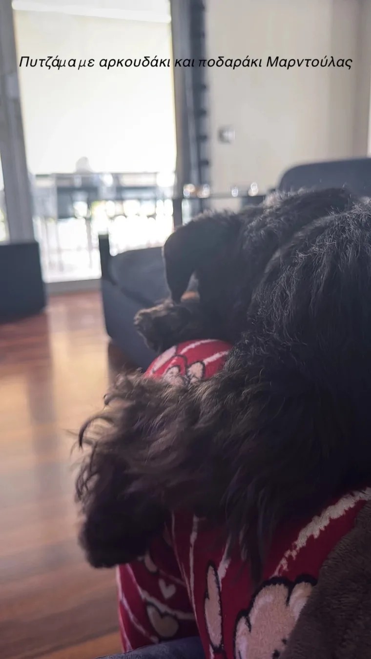 Η παρουσιάστρια του Chase καθισμένη στον μεγάλο σκουρόχρωμο καναπέ της αγκαλιά με το σκυλάκι της. «Πιτζάμα με αρκουδάκι και ποδαράκι Μαρντούλας», έγραψε χαρακτηριστικά η Μαρία Μπεκατώρου. Όπως θα δεις κι εσύ στη φωτογραφία το σαλόνι της είναι μεγάλο με huge καναπέδες και ξύλινο πάτωμα.
