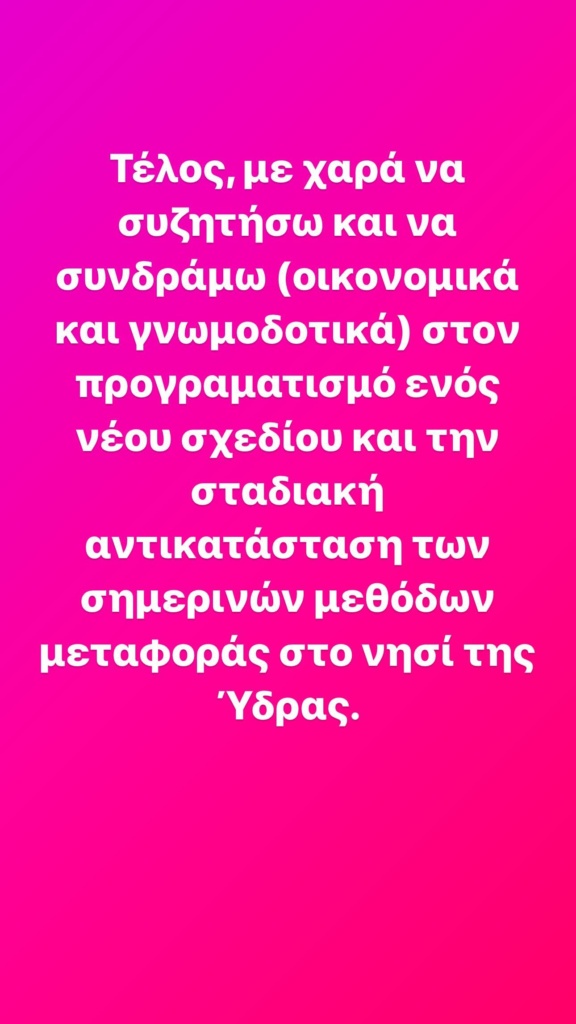 Τέλος, με χαρά να συζητήσω και να συνδράμω οικονομικά και γνωμοδοτικά) στον προγραμματισμό ενός νέου σχεδίου και τη σταδιακή αντικατάσταση των σημερινών μεθόδων μεταφοράς στο νησί της Ύδρας», ανέφερε χαρακτηριστικά.