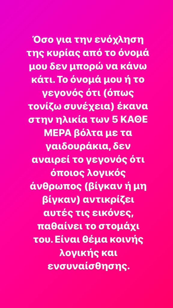 Όσο για την ενόχληση της κυρίας από το όνομά μου δεν μπορώ να κάνω κάτι. Το όνομά μου ή το γεγονός ότι (όπως τονίζω συνέχεια) ‘έκανα στην ηλικία των 5 ΚΑΘΕ ΜΕΡΑ βόλτα με τα γαϊδουράκια δεν αναιρεί το γεγονός ότι όποιος λογικός άνθρωπος (βίγκαν ή μη) αντικρίζει αυτές τις εικόνες, παθαίνει το στομάχι του. Είναι θέμα κοινής λογικής και ενσυναίσθησης.