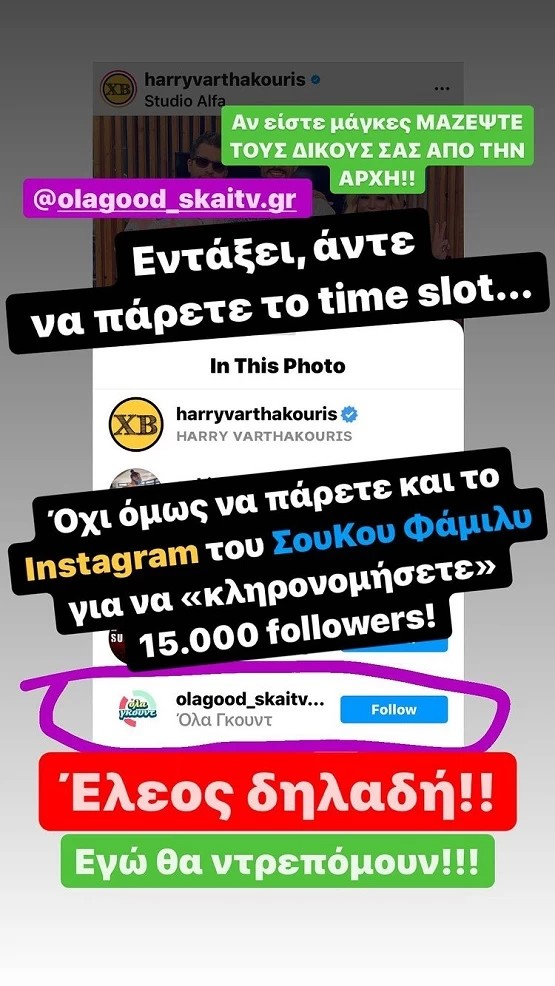 Ο επίσημος λογαριασμός της εκπομπής «ΣουΚου» μετονομάστηκε σε «Όλα γκουντ» και αυτό δεν άρεσε καθόλου στον γιο του Γιάννη Πάριου, ο οποίος με δύο δημοσιεύσεις στον προσωπικό του λογαριασμό στο instagram θέλησε να μοιραστεί με τους ακόλουθούς του αυτό ακριβώς που συνέβη, γράφοντας, μεταξύ άλλων, «Έλεος δηλαδή, εγώ θα ντρεπόμουν».