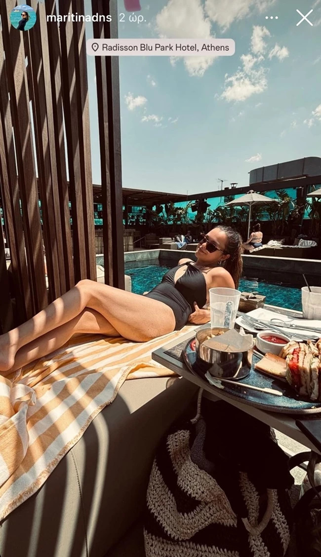 Για την εκδρομή της σε ένα ξενοδοχείο στην Αθήνα, η Μαριτίνα επέλεξε ένα μαύρο ολόσωμο μαγιό με λεπτομέρειες cut out. Πόζαρε πάνω στην ξαπλώστρα της, ενώ τα μαλλιά της ήταν καλά τοποθετημένα σε μια αλογοουρά, σύμφωνα με το συνηθισμένο της στυλ.
