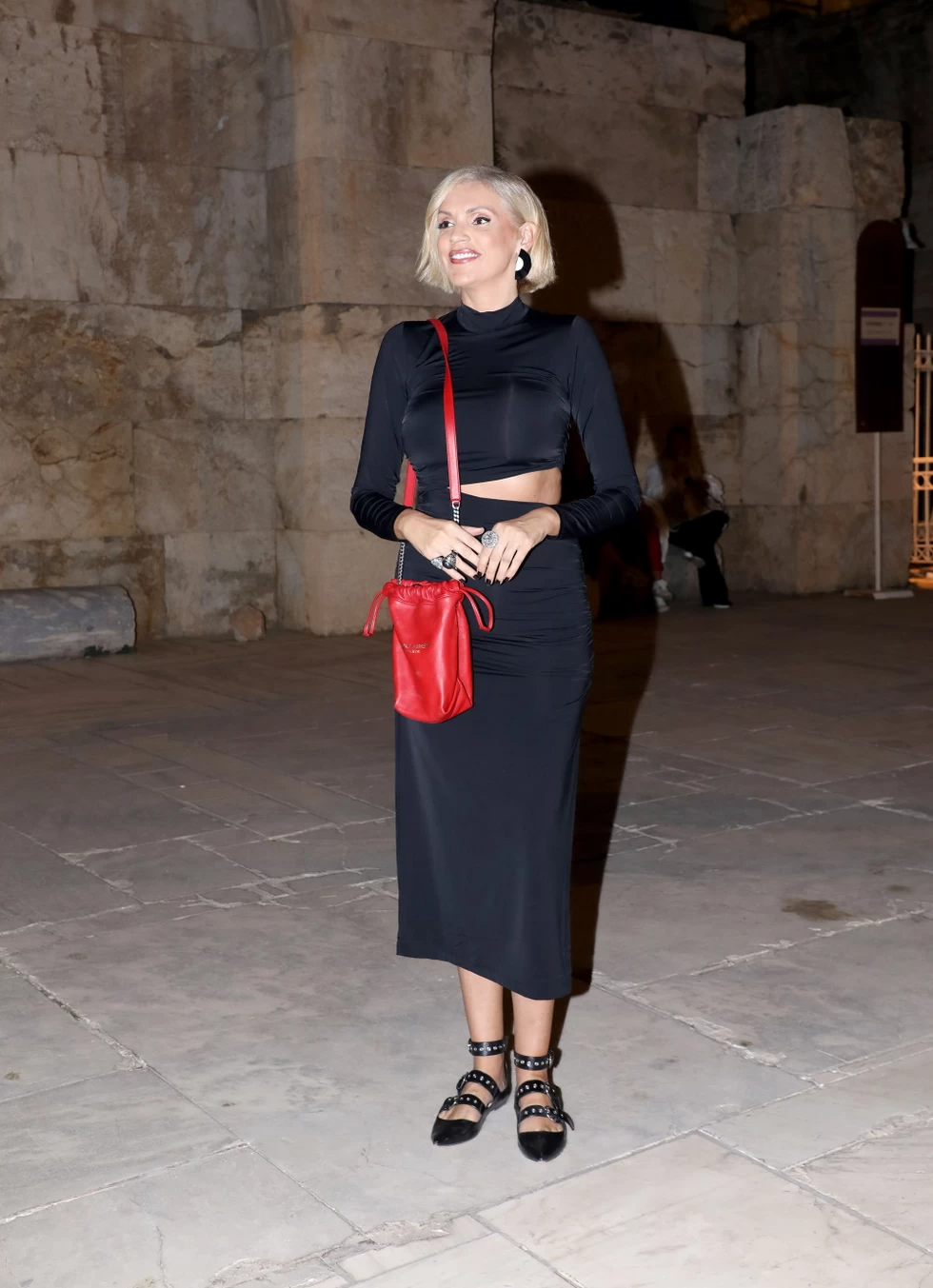 Ειδικότερα, η δημοσιογράφος επέλεξε ένα μαύρο ντραπέ φόρεμα, με όρθιο γιακά και μακριά μανίκια, σε midi μήκος και με άνοιγμα στη μέση, το οποίο συνδύασε με ροκ μπαλαρίνες με αγκράφες και κόκκινη τσάντα σε στυλ πουγκί.