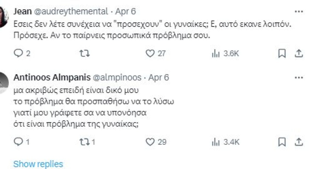 Η ανάρτησή του συζητήθηκε έντονα από όσους τον ακολουθούν και όχι μόνο. «Έχετε σκεφτεί ότι αυτή η γυναίκα μπορεί να έχει ένα τραύμα που σχετίζεται με έμφυλη βία;» είναι ένα από τα σχόλια που δέχτηκε, στο οποίο ο Αντίνοος Αλμπάνης και απάντησε: «Μα δεν την έκρινα και τίποτα να μην έχει ζήσει έχει κάθε λόγο να φοβάται και έχω κάθε λόγο να επηρεάζομαι από τον φόβο που της προκαλώ».