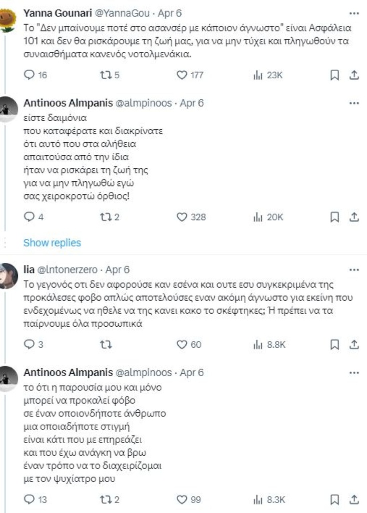 Κάποιος άλλος του έγραψε: «Το “Δεν μπαίνουμε ποτέ στο ασανσέρ με κάποιον άγνωστο” είναι Ασφάλεια 101 και δεν θα ρισκάρουμε τη ζωή μας, για να μην τύχει και πληγωθούν τα συναισθήματα κανενός νοτολμενάκια».