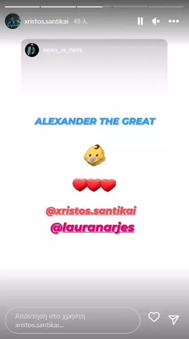 Ο γνωστός καλλιτέχνης έκανε γνωστή την χαρμόσυνη είδηση, μέσα από μία φωτογραφία που ανέβασε με το χεράκι του βρέφους, στέλνοντας ένα μήνυμα προς την σύντροφό του. «Καλωσήρθες αντράκο μου! Λάουρα, σ’ ευχαριστώ, σ’ αγαπάω», έγραψε χαρακτηριστικά ο Χρήστος Σαντικάι.
