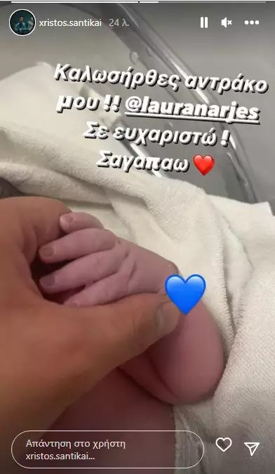 Ο γνωστός καλλιτέχνης έκανε γνωστή την χαρμόσυνη είδηση, μέσα από μία φωτογραφία που ανέβασε με το χεράκι του βρέφους, στέλνοντας ένα μήνυμα προς την σύντροφό του. «Καλωσήρθες αντράκο μου! Λάουρα, σ’ ευχαριστώ, σ’ αγαπάω», έγραψε χαρακτηριστικά ο Χρήστος Σαντικάι.
