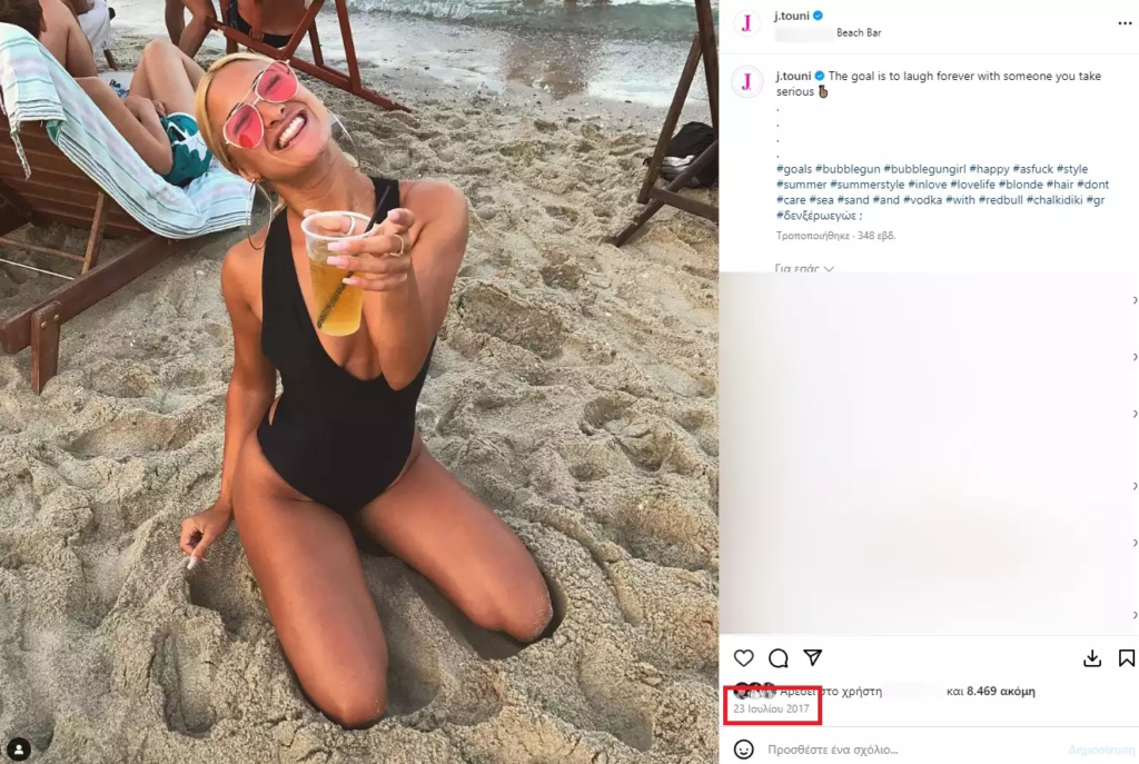 Όπως βλέπετε στη φωτογραφία που παρουσίασε το T-live, στις 23 Ιουλίου του 2017, η Ιωάννα Τούνη ποζάρει μπροστά στην κάμερα, χαμογελαστή και ευδιάθετη, πίνοντας, όπως γράφει η ίδια, βότκα με γνωστό ισοτονικό ποτό. Τότε, δεν μπορούσε να φανταστεί τα όσα θα διαδραματίζονταν λίγες ώρες αργότερα μέσα στο λευκό range rover του 36χρονου.