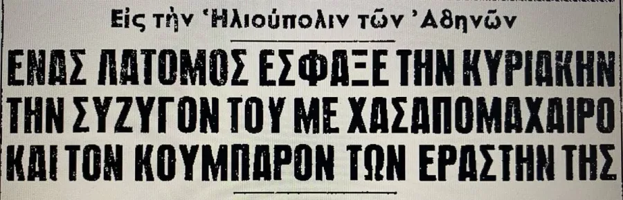 «Καθόντουσαν ήσυχοι. Δεν τους είδα να είναι πιασμένοι από τα χέρια, όπως κάνουν εκείνοι που αγαπιούνται. Δεν φιλιόντουσαν, δεν κάνανε τίποτε άλλο, φίλοι ήσαν όπως λένε. Ο κύριος και η κυρία βρισκόντουσαν στο σπίτι όταν χτύπησε η πόρτα και φάνηκε ο κουμπάρος. Τον καλωσόρισαν και οι δύο και η κυρία μου είπε να πάω δίπλα στον πατέρα της να πάρω φακές και λάδι. Μα δεν είχα φτάσει καλά καλά στην πόρτα και την βλέπω να βγαίνει καταματωμένη, να τρέχει προς το μπακάλικο, να τρεκλίζει σε μια στιγμή, να πιάνεται από μια καρέκλα που ήταν απέξω και να πέφτει κάτω ξερή»