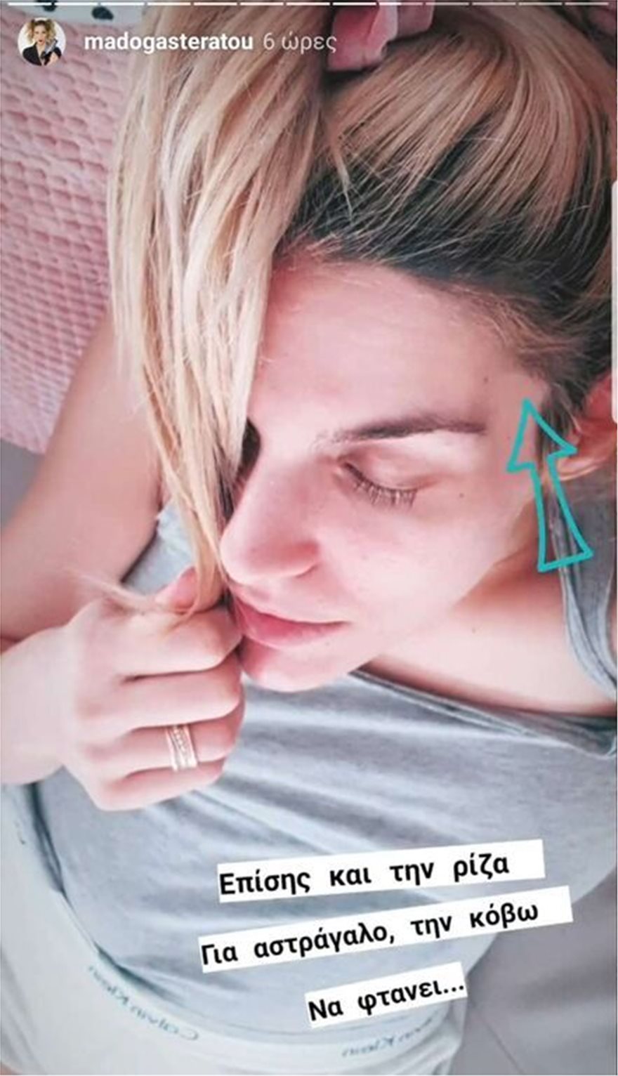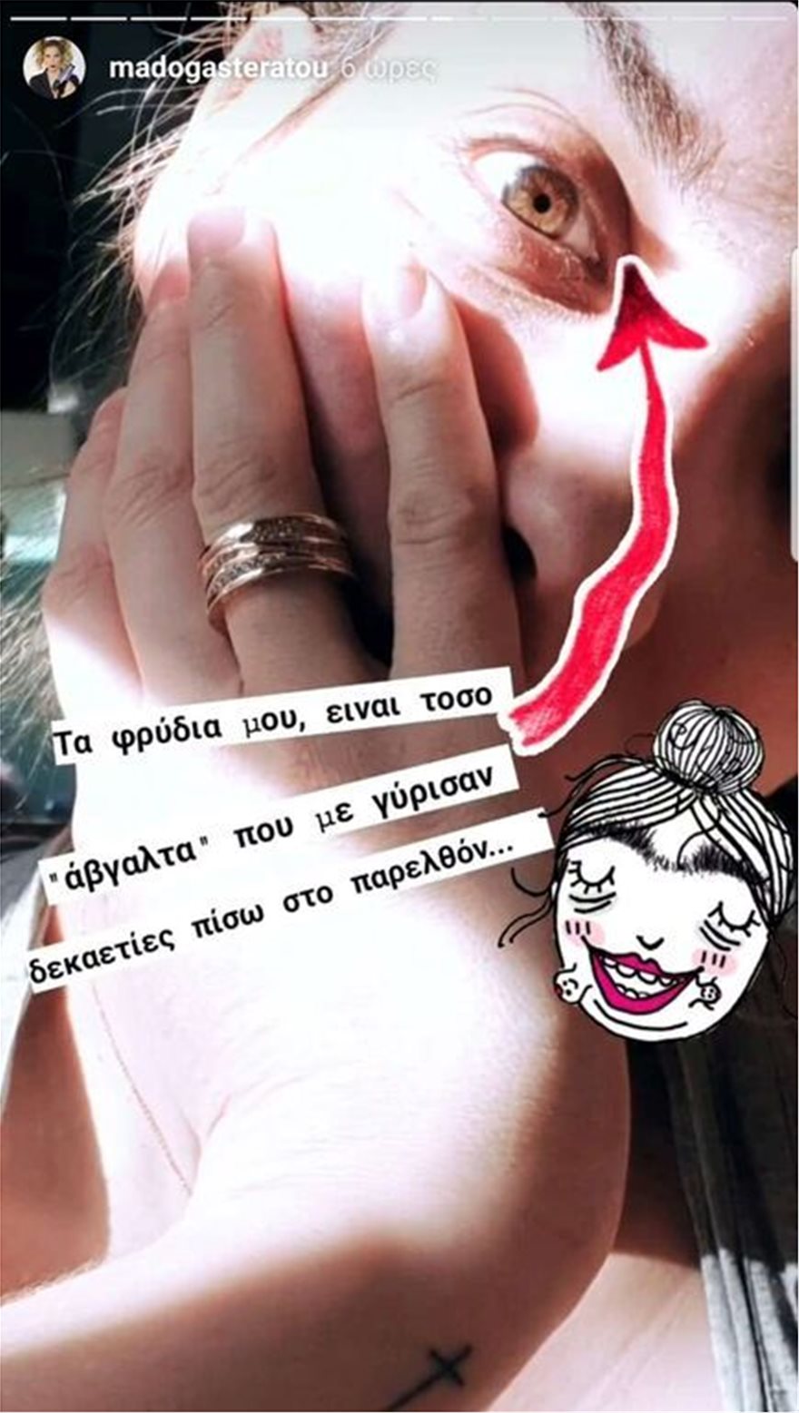 Η παρουσιάστρια αυτοσαρκαζόμενη έδειξε τους μαύρους κύκλους κάτω από τα φρύδια της από τα πολλά ξενύχτια. Επίσης, όπως είπε λόγω έλλειψης χρόνου δεν προλαβαίνει ούτε τα φρύδια της να φτιάξει ούτε να πάει στο κομμωτήριο να βάψει τη ρίζα της.Λέει χαρακτηριστικά: «Εν τω μεταξύ τέτοια ξενύχτια δεν έχω ρίξει ούτε στα νιάτα μου. Τα φρύδια μου είναι τόσο “άβγαλτα” που με γύρισαν δεκαετίες πίσω στο παρελθόν. Επίσης και την ρίζα, για αστράγαλο την κόβω να φτάνει..», είπε μεταξύ άλλων η Μαντώ Γαστεράτου που παρόλο που φαίνεται κουρασμένη από την αϋπνία είναι μια κούκλα!