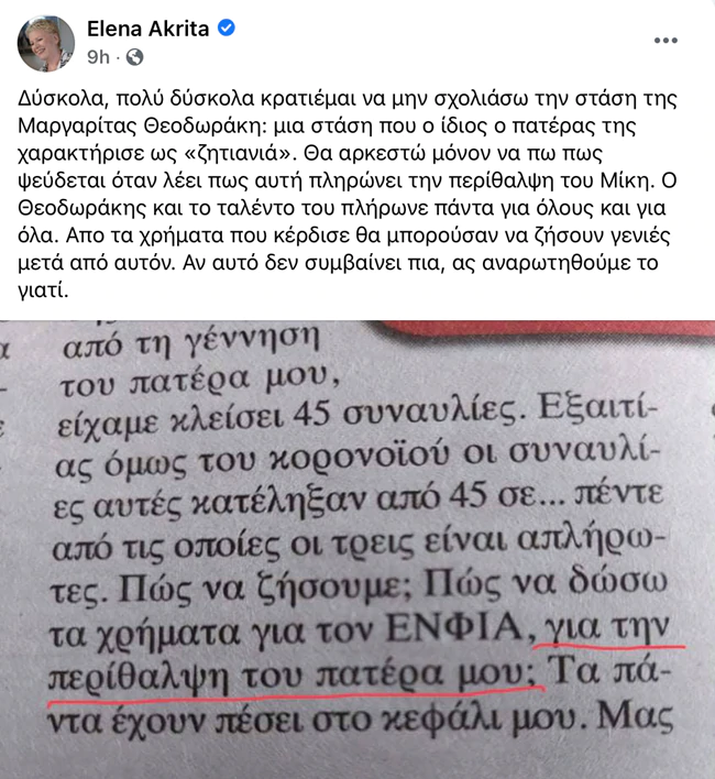 Έχει μεγάλο δίκιο η Έλενα Ακρίτα που θύμωσε πολύ με τις δηλώσεις της Μαργαρίτας και έγραψε: “Ψεύδεται όταν λέει πως αυτή πληρώνει την περίθαλψη του Μίκη. Ο Θεοδωράκης και το ταλέντο του πλήρωνε πάντα για όλους και για όλα. Από τα χρήματα που κέρδισε θα μπορούσαν να ζήσουν γενιές μετά από αυτόν. Αν αυτό δεν συμβαίνει πια, ας αναρωτηθούμε το γιατί”.