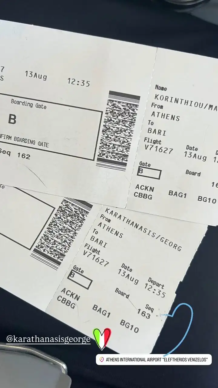 Πιο συγκεκριμένα σήμερα Τετάρτη 13 Αυγούστου, η Μαρία Κορινθίου και ο Γιώργος Καραθανάσης πέταξαν για το Μπάρι της Ιταλίας. Η ηθοποιός μοιράστηκε στα Instagram Stories της τα αεροπορικά εισιτήρια τους, αποκαλύπτοντας έτσι τον νέο ρομαντικό προορισμό που επέλεξαν.