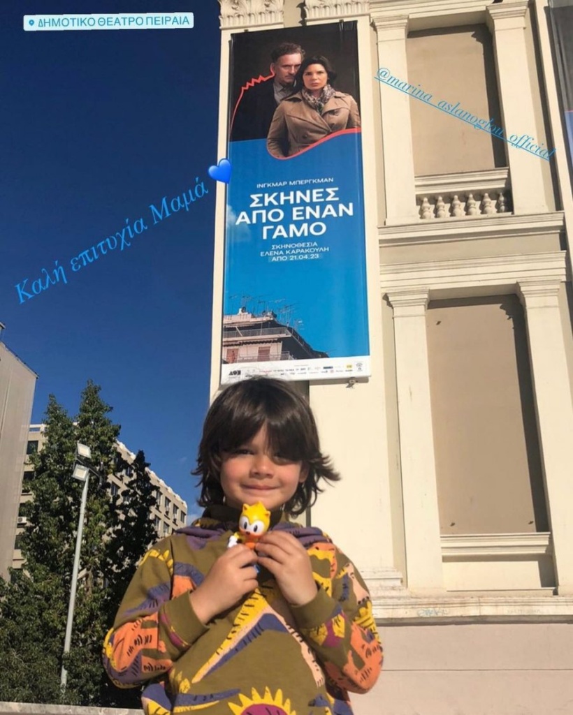 Εξαίρεση αποτελεί η παρακάτω φωτογραφία, την οποία δημοσίευσε ο Δήμος Πέππας και στο προφίλ της γνωστής ηθοποιού. Ο πεντάχρονος Κωνσταντίνος ποζάρει έξω από το δημοτικό θέατρο εκεί όπου σε δύο μέρες έχει πρεμιέρα η θεατρική παράσταση «Σκηνές από έναν γάμο» στην οποία συμπρωταγωνιστούν η Μαρίνα Ασλάνογλου και ο Νίκος Ψαρράς.