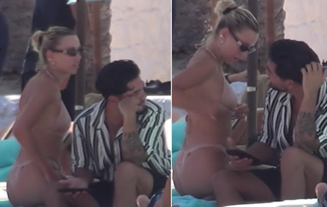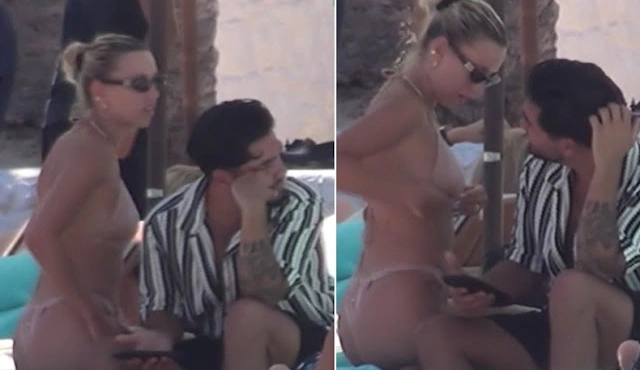 Κατά την παραμονή τους στο νησί των ανέμων, ωστόσο, τους συνάντησε και η κάμερα του Mykonos Live Tv σε γνωστό beach bar στην Ψαρρού, την ώρα που απολάμβαναν το μπάνιο τους στην θάλασσα. Το μοντέλο είχε ξαπλώσει στην ξαπλώστρα και χάζευε στο κινητό της, ενώ ο τραγουδιστής στεκόταν καθιστός δίπλα της και κοιτούσε το δικό του κινητό.
