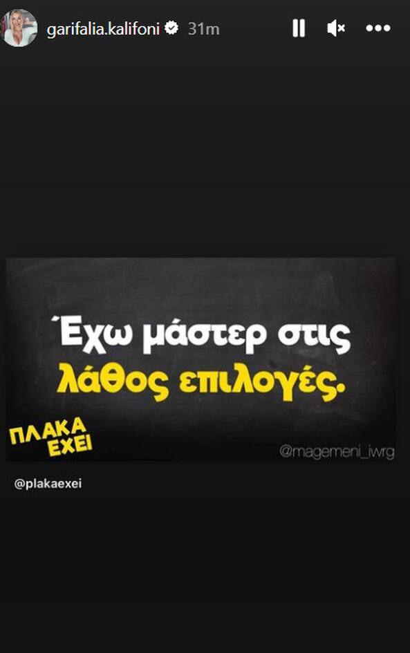 Μάλιστα, το story που ανάρτησε στον προσωπικό της λογαριασμό στο Instagram η Γαρυφαλλιά Καληφώνη και κάνει λόγο για «λάθος επιλογές» μάλλον επιβεβαιώνει το ρεπορτάζ.