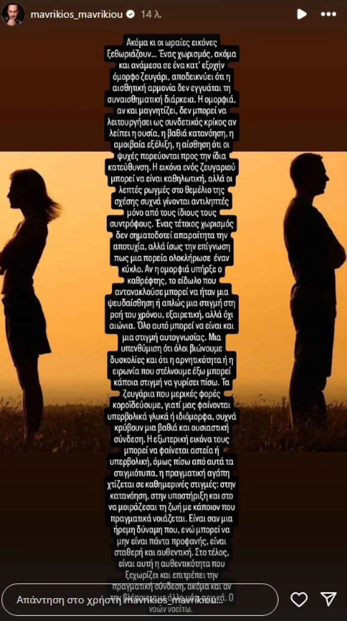 Ωστόσο, η Ιωάννα Τούνη θέλησε να βάλει ένα τέλος στα όσα λέγονται, με την ίδια να επιβεβαιώνει εχθές μέσα από τα social media της ότι ο χωρισμός της με τον Δημήτρη Αλεξάνδρου είναι οριστικός – δείτε εδώ αναλυτικά τι δημοσίευσε -. Όπως ήταν λογικό, σήμερα, Τετάρτη 26 Φεβρουαρίου, πολλοί επώνυμοι και τηλεοπτικής εκπομπές έχουν λάβει θέση για τις εξελίξεις αυτές, ανάμεσα τους, και ο Μαυρίκιος Μαυρικίου, ο οποίος μέσα από ένα μακροσκελές μήνυμα στον προσωπικό του λογαριασμό στο Instagram τοποθετήθηκε επί του θέματος.