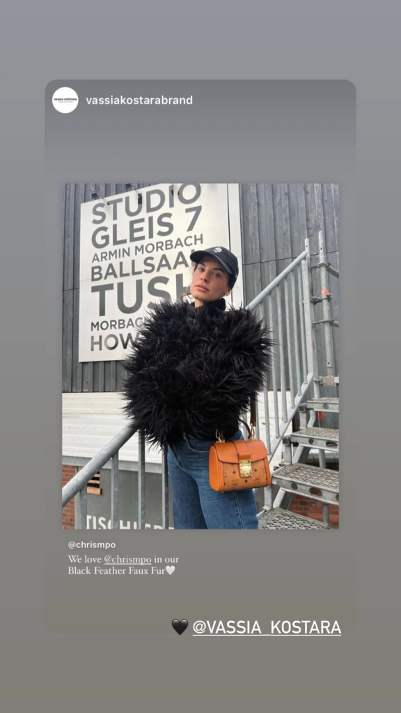 Η Χριστίνα Μπόμπα μας δείχνει πώς να έχουμε στυλ στο κρύο με ένα από τα πιο δημοφιλή κομμάτια της σεζόν. Πρόκειται για το feather faux fur τζάκετ που επέλεξε σε μαύρο χρώμα. Το συγκεκριμένο ανήκει στη συλλογή Vassia Kostara και κοστίζει 280 ευρώ.