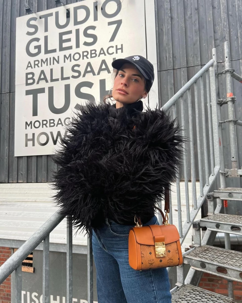 Η Χριστίνα Μπόμπα το συνδύασε με τζιν παντελόνι και τσάντα MCM σε καφέ τόνους.
