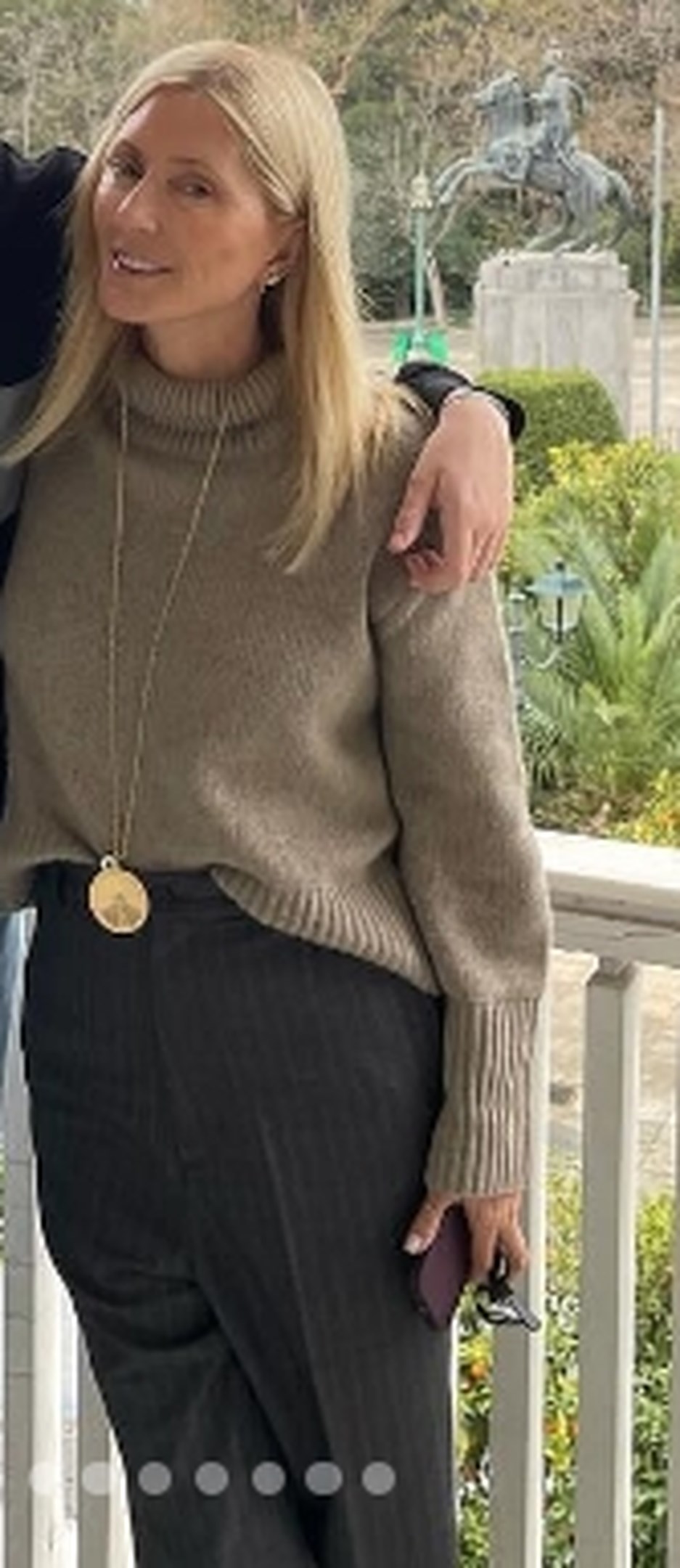 Ακόμα την είδαμε να φοράει υφασμάτινο μαύρο παντελόνι με ρίγες, και μπεζ πουλόβερ, με ένα κρεμαστό κολιέ στο λαιμό.