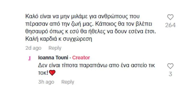 «Η ΔΥΣΤΥΧΙΑ ΤΗΣ ΚΑΜΕΡΑΣ – Πολύ μεγάλη ιδέα έχεις για τον εαυτό σου, συνεχώς προκαλείς και νομίζεις ότι είσαι η μοναδική πετυχημένη γυναίκα στον κόσμο και όταν σου την λένε απαντάς με κακία και πιστεύεις ότι σε ζηλεύουν – Κοντεύεις σαράντα και ακόμα σκέφτεσαι σαν δεκαπεντάχρονο τους πρώην κι άλλα τέτοια… Μάλλον ο πρώην πέτυχε τζακ ποτ που γλύτωσε από εσένα – Καλό είναι να μην μιλάμε για ανθρώπους που πέρασαν από την ζωή μας. Κάποιος θα τον βλέπει θησαυρό, όπως και εσύ θα ήθελες να δουν εσένα έτσι. Καλή καρδιά και συγχώρεση», ήταν κάποια από τα σχόλια που δέχτηκε η Ιωάννα Τούνη κάτω από την ανάρτησή της.
