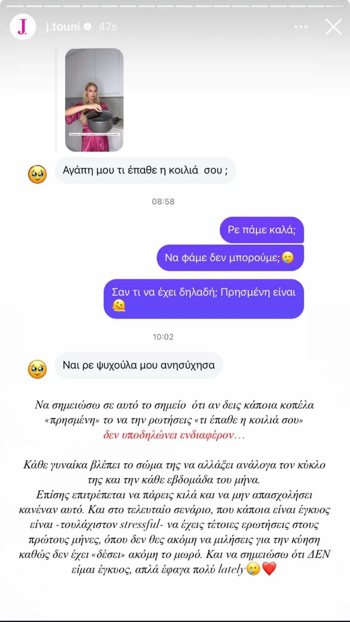 Συγκεκριμένα, η εν λόγω follower την ρώτησε σε προσωπικό μήνυμα τι έπαθε η κοιλιά της, καθώς σε ένα βίντεο φαινόταν φουσκωμένη, και η Ιωάννα Τούνη ξεκαθάρισε ότι δεν έγκυος, απλώς έφαγε λίγο παραπάνω το τελευταίο διάστημα.