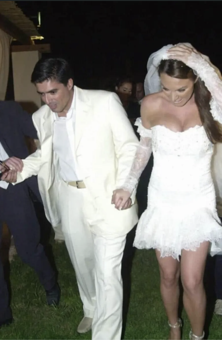 Το νυφικό της Τατιάνας Στεφανίδου είχε την υπογραφή του Μάκη Τσέλιου, ενώ έκανε εντύπωση το mini μήκος του, το οποίο αναδείκνυε τα υπέροχα πόδια της. Η Τατιάνα Στεφανίδου μάλιστα έκανε αυτή την τολμηρή επιλογή του κοντού νυφικού, ενώ ήταν έγκυος στην κόρη της Λυδία. Στα μαλλιά της φορούσε ένα μακρύ πέπλο και δαντελωτά γάντια μέχρι τον αγκώνα, που έκαναν ακόμη πιο εντυπωσιακή την εμφάνισή της.