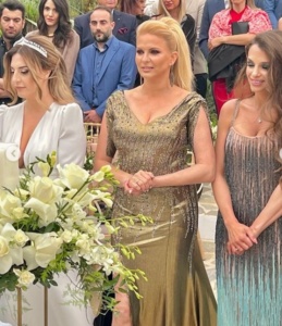 Για τον ρόλο της κουμπάρας, η Μάγδα Τσέγκου επέλεξε ένα εντυπωσιακό μεταλλιζέ μάξι χρυσαφί φόρεμα κεντημένο με πετράδια και μεγάλο σκίσιμο στο πόδι. Στο πλευρό της είχε τον πανύψηλο σύντροφό της, Πέτρο Κελέση.