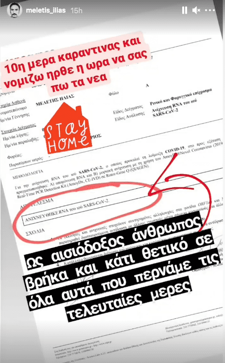 Θετικός στον κορονοϊό διαγνώστηκε ο γνωστός ηθοποιός, Μελέτης Ηλίας, ο οποίος μέσω story που έκανε στο instagram, έδειξε το θετικό αποτέλεσμα του μοριακού τεστ.