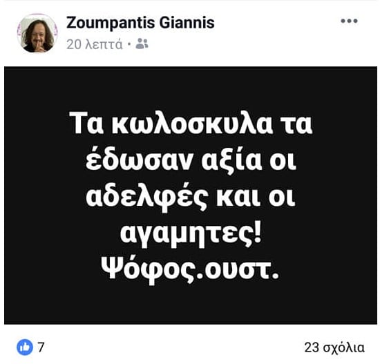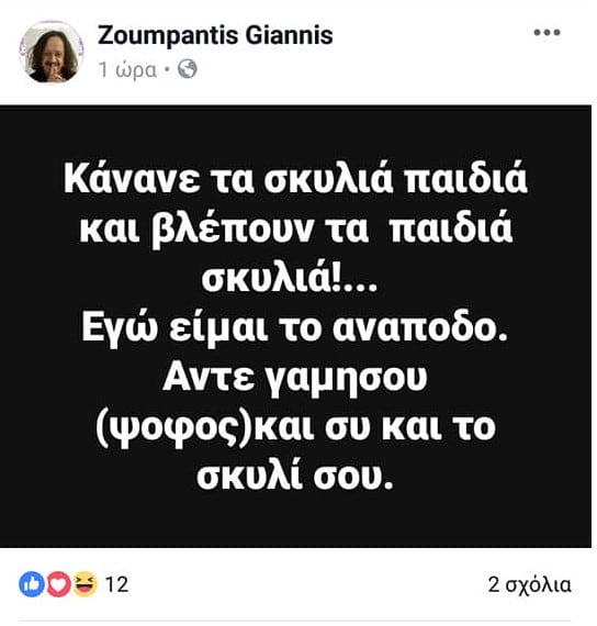 «Κάνανε τα σκυλιά παιδιά και βλέπουν τα παιδιά σκυλιά. Εγώ είμαι το ανάποδο. Άντε γ@μήσου (ψόφος) και συ και το σκυλί σου» είχε σε άλλη ανάρτηση. Δεν θέλω να τον στηλιτεύσω αλλά αυτές οι αναρτήσεις δεν χωρούν στα μέσα κοινωνικής δικτύωσης και θα έπρεπε αυτές οι απόψεις να μην χαίρουν αποδοχής…ούτε από τα μέσα κοινωνικής δικτύωσης, ούτε και τον κόσμο. Ελπίζω και εύχομαι να έχει αλλάξει γνώμη…