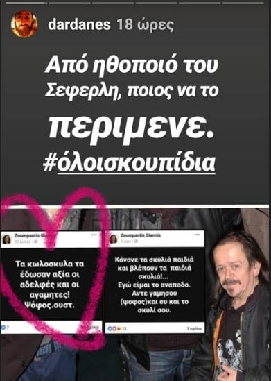 Συγκεκριμένα ο ηθοποιός το 2019 είχε γράψει στα social media: «Τα κ@λόσκυλα τα έδωσαν αξία οι αδελφές και οι αγ@μήτες. Ψόφος. ουστ», ανέφερε σε μια ανάρτησή του γεμάτη μίσος για ανθρώπους και ζώα.