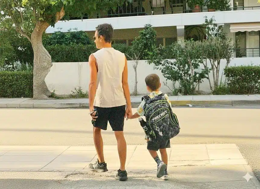 Ο ηθοποιός, Μιχάλης Οικονόμου συνόδευσε τον γιο του στην πρώτη του ημέρα στο σχολείο, συνοδευόμενος από τον σύζυγό του, Γιώργο Μακρή.