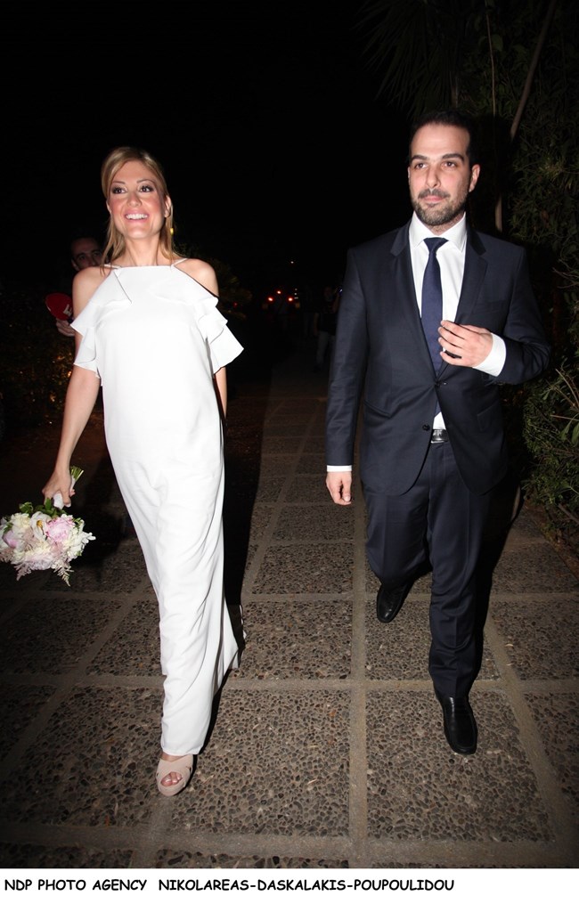 Η παρουσιάστρια του κεντρικού δελτίου ειδήσεων του MEGA επέλεξε να φορέσει ένα ολόλευκο μάξι νυφικό σε αέρινο ύφασμα και βολάν στο πάνω μέρος, καθώς το ζευγάρι επέλεξε να κάνει πολιτικό γάμο.
