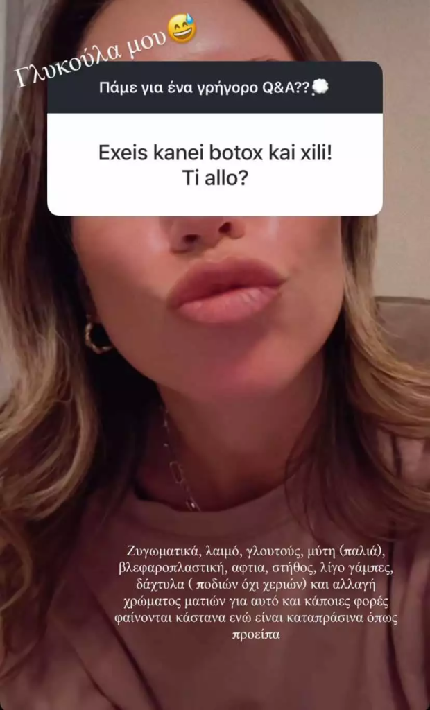 Σε ερώτηση για τις πλαστικές επεμβάσεις, απάντησε χιουμοριστικά γράφοντας: «Ζυγωματικά, λαιμό, γλουτούς, μύτη (παλιά), βλεφαροπλαστική, αφτιά, στήθος, λίγο γάμπες, δάχτυλα (ποδιών και χεριών) και αλλαγή χρώματος ματιών για αυτό και κάποιες φορές φαίνονται καστανά ενώ είναι καταπράσινα όπως είπα».