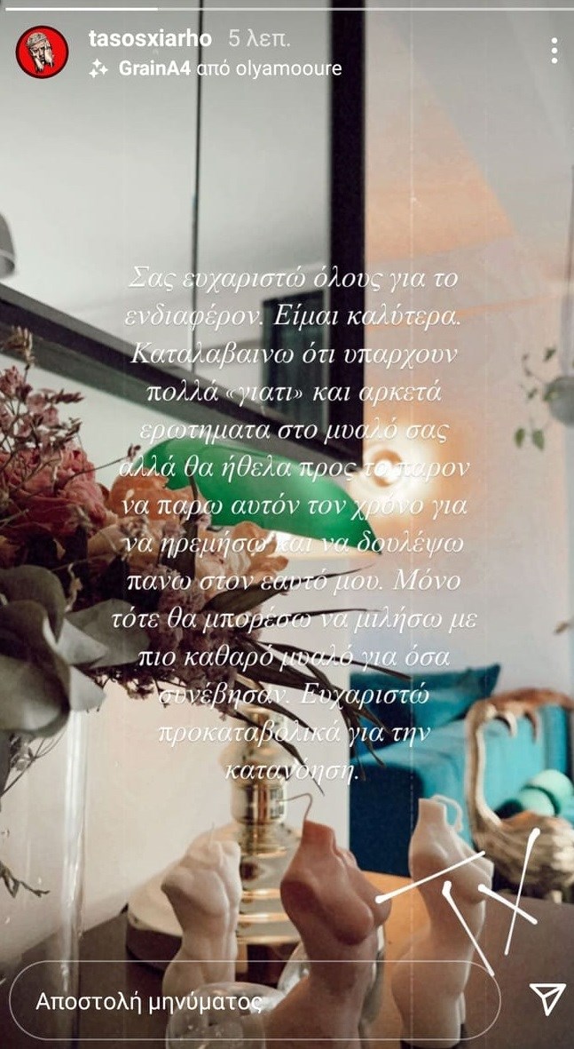«Δεν θέλω να πω κάτι παραπάνω. Κάνω ένα ωραίο ξεκαθάρισμα για να μπορέσω να έχω το μυαλό μου καθαρό και να πορευτώ από αύριο και να ξεκινήσω να διορθώνω τα λάθη μου. Να δω τι είναι σωστό και τι όχι. Πλέον είμαι αρκετά καλά και στην υγεία μου γιατί μου κάνανε πλύση στομάχου… Τώρα είμαι καλά», πρόσθεσε ο Τάσος Ξιαρχό.
