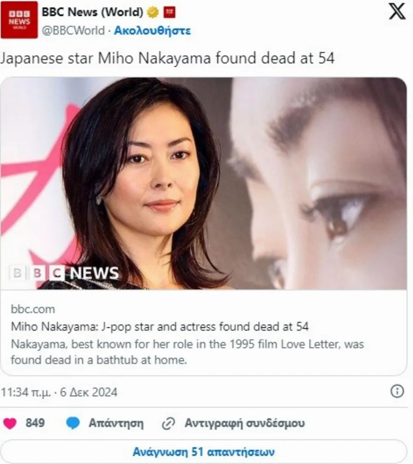 Η Ιαπωνέζα ηθοποιός Μίχο Νακαγιάμα βρέθηκε νεκρή στην μπανιέρα του σπιτιού της στο Τόκιο, σύμφωνα με αναφορές των μέσων ενημέρωσης.