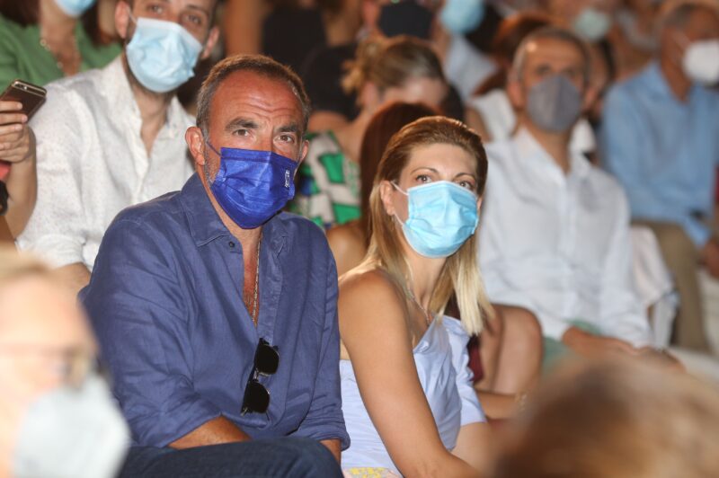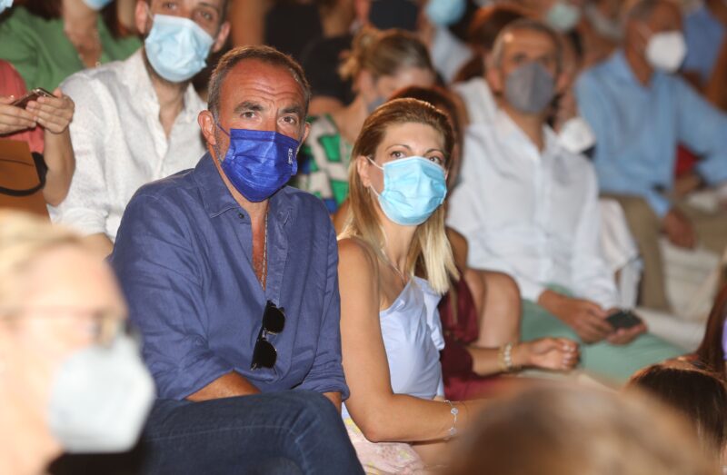 Το ζευγάρι φορώντας τις απαραίτητες μάσκες προστασίας για τον κορωνοϊό, εισήλθε στο χώρο και κάθισε σε μία από τις πρώτες σειρές του Ωδείου Ηρώδου Αττικού.