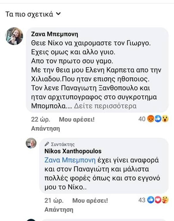 Ειδικότερα, ο Νίκος Ξανθόπουλος έγραψε «Χρόνια πολλά Γιώργο μου.. Πολύχρονος κι ευτυχισμένος να ‘σαι πάντα γιε μου. Να σε χαιρόμαστε που ‘σαι λεβέντης», με την ανιψιά του να σχολιάζει «Θείε Νίκο να χαιρόμαστε τον Γιώργο. Έχεις όμως και άλλο γιο. Από τον πρώτο σου γάμο με τη θεία μου, Ελένη Καρπέτα από την Χιλιαδου, που ήταν επίσης ηθοποιός. Τον λένε Παναγιώτη Ξανθόπουλο και ήταν αρχιτυπογράφος στο συγκρότημα Μπόμπολα. Σου έχει χαρίσει εγγόνια. Μήπως να το ανέφερες κάποτε; Το λέω με αγάπη».