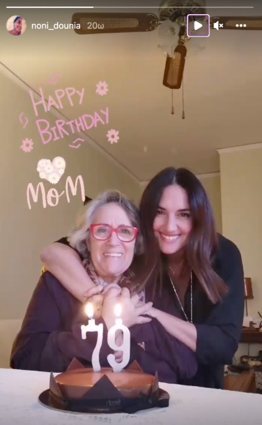 Εκτός από τη δημοσίευση, η Νόνη Δούνια γιόρτασε εις διπλούν τη μαμά της με μία ακόμη κοινή τους φωτογραφία στα stories, όπου και βλέπουμε πόσο μοιάζουν μεταξύ τους. Μαμά και κόρη ποζάρουν στον φωτογραφικό φακό χαμογελαστές και αγκαλιασμένες, πίσω από την τούρτα με τα 79 κεράκια.