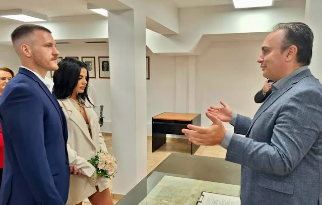 Η τελετή πραγματοποιήθηκε στο Δημαρχιακό Μέγαρο της Ιστιαίας σε στενό οικογενειακό κύκλο, με το ζευγάρι να έχει στο πλευρό του λίγους συγγενείς και φίλους.