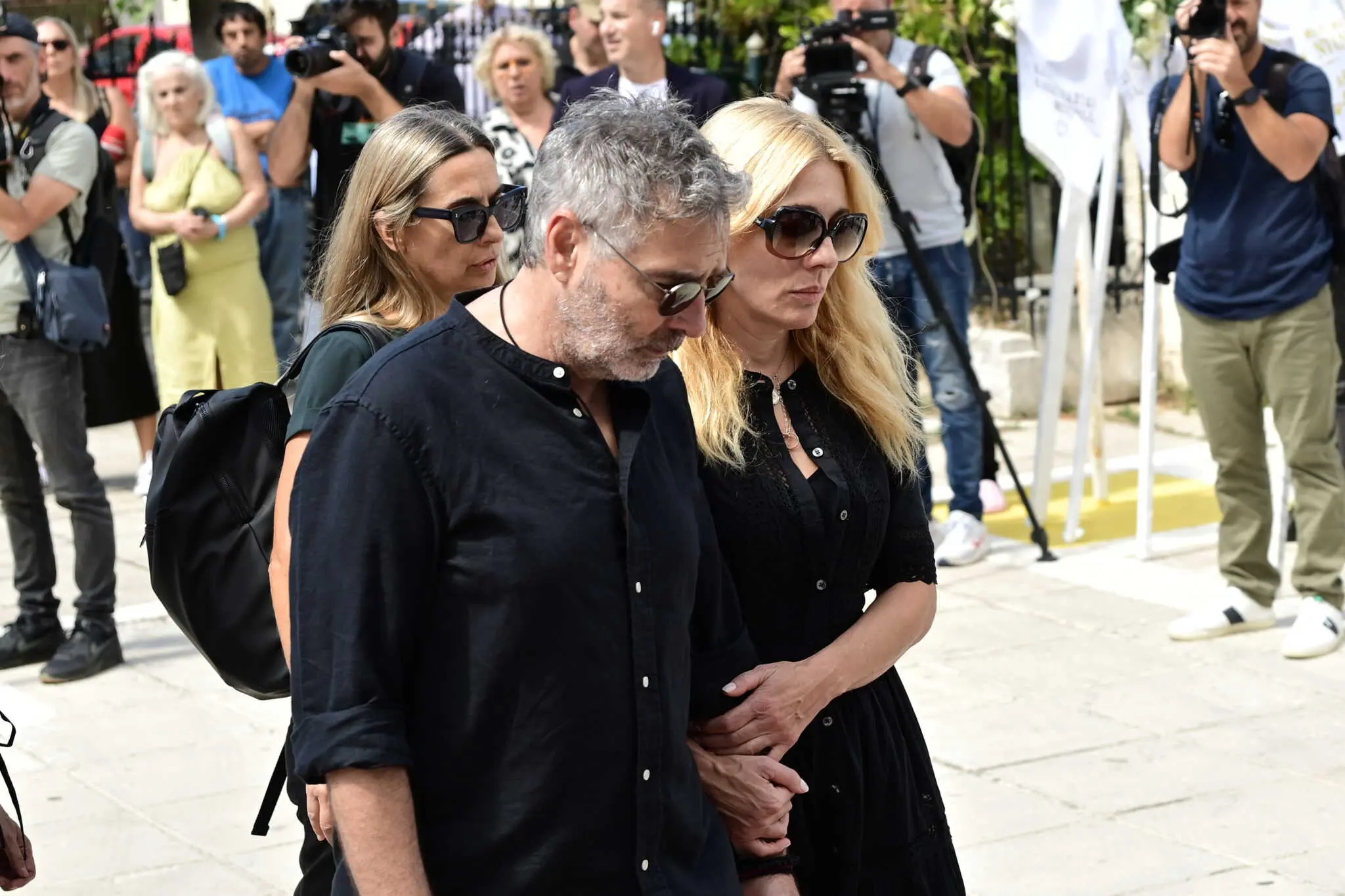 Τραγικές φιγούρες η Σμαράγδα Καρύδη και ο Θοδωρής Αθερίδης που έφτασαν στο Κοιμητήριο ντυμένοι στα μαύρα και βαθιά καταβεβλημένοι.
