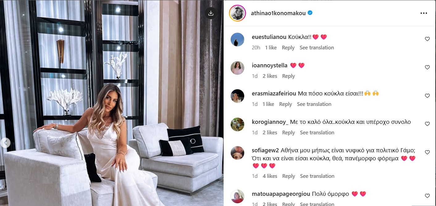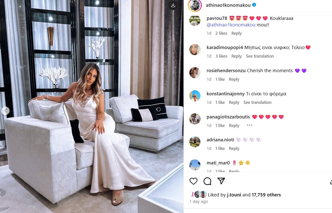 Η Αθηνά επέλεξε να ποζάρει φορώντας ένα λευκό σατέν φόρεμα που θυμίζει νυφικό και αμέσως οι διαδικτυακοί της φίλοι άρχισαν να σχολιάζουν: «Αθηνά σα νύφη είσαι.. Κούκλα πάντα», «Με το καλό», «Είναι νυφικό; Είναι τέλειο», «Αθήνα μου μήπως είναι νυφικό για πολιτικό Γάμο; Ότι και να είναι είσαι κούκλα, θεά, πανέμορφο φόρεμα».