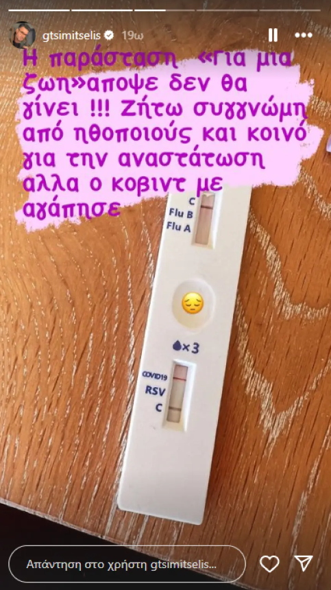 Συγκεκριμένα, ανάρτησε μια φωτογραφία με το θετικό τεστ κορωνοϊού και ενημέρωσε τους διαδικτυακούς του φίλους ότι η παράσταση «Για μια ζωή» αναβάλλεται, μέχρι να αναρρώσει.