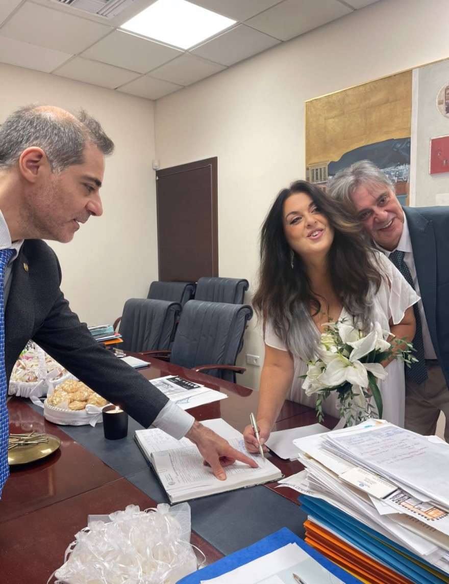 Η Ντίνα ανάρτησε στα social media στιγμιότυπα από τον γάμο τους, αποκαλύπτοντας έτσι το γεγονός. Στις φωτογραφίες φαίνεται ο γνωστός ηθοποιός να ποζάρει με τη σύντροφό του στην αίθουσα του δημαρχείου, ευδιάθετος και συγκινημένος.