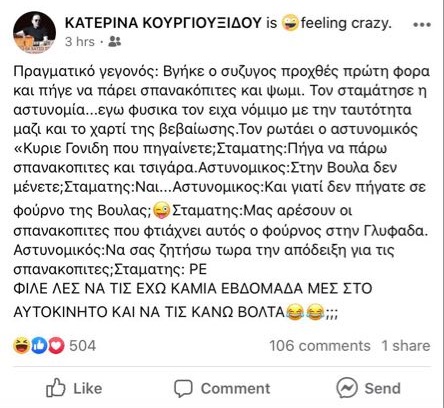 «Πραγματικό γεγονός. Βγήκε ο σύζυγος προχθές πρώτη φορά και πήγε να πάρει σπανακόπιτες και ψωμί. Τον σταμάτησε η αστυνομία… εγώ φυσικά τον είχα νόμιμο με την ταυτότητα μαζί και το χαρτί της βεβαίωσης. Τον ρωτάει ο αστυνομικός ”Κύριε Γονίδη πού πηγαίνετε;”