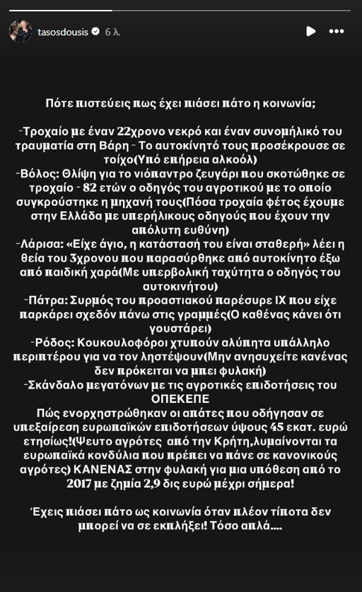 Ο Τάσος Δούσης επανήλθε με ανάρτησή του στο Instagram, στην οποία αναφέρθηκε σε όλες τις παθογένειες της ελληνικής κοινωνίας, τονίζοντας… δίχως μαλλιά στη γλώσσα, το τι φέρνει την κατάντια ενός κοινωνικού συνόλου.