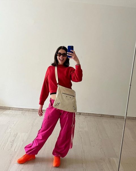 Συγκεκριμένα, φόρεσε ένα cargo, φαρδύ, baggie παντελόνι σε φούξια και από πάνω ένα κατακόκκινο κοντό πουλοβεράκι. Τα πορτοκαλί sneakers της σε neon απόχρωση ήταν αυτά που απογείωσαν το look.